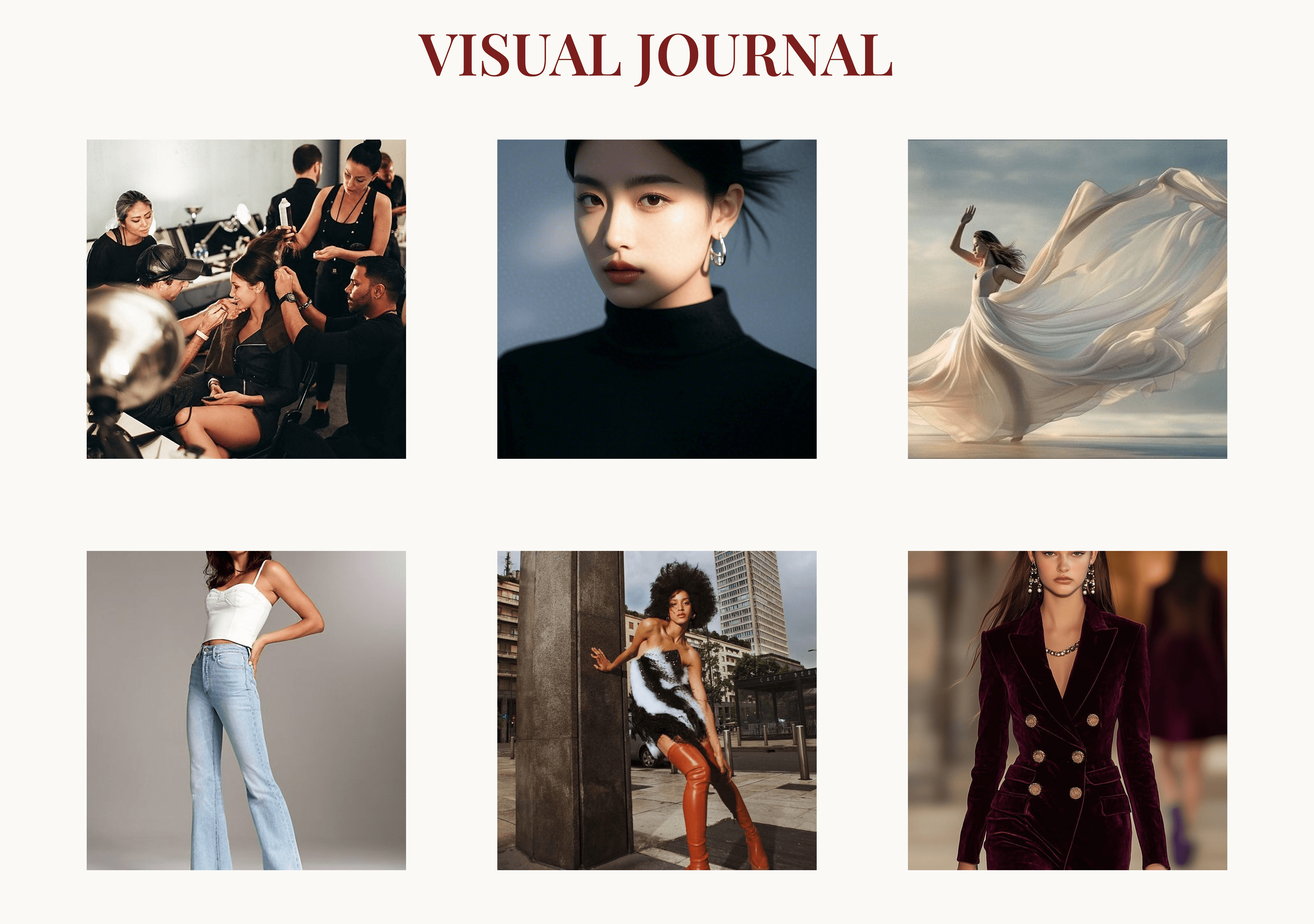 A bold combination of text and imagery arranged asymmetrically for rhythm and depth. This section breaks the visual flow intentionally — echoing the creative unpredictability of fashion spreads.